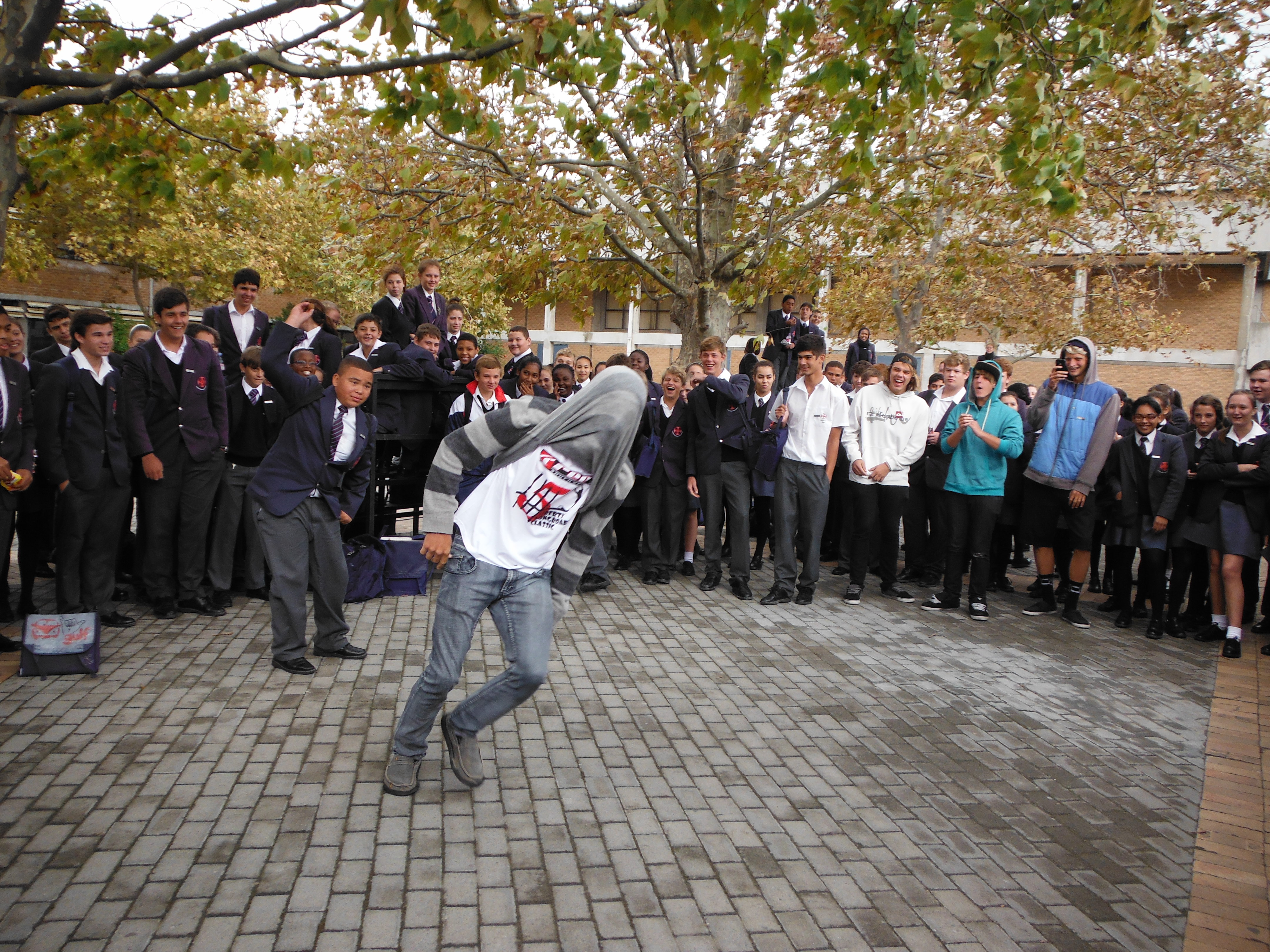 We tore down the scaffolding tower and wrapped things up from the surf contest and headed to Melkbos. We are now here serving with Daniel Domancie with Kingdom Longboards (skateboards), putting on local skate events and serving at the churches here. For advertising of the youth event this coming Friday, Andy and I went to the highschool to promo the event. It’s pretty scary pumping tunes and speaking on a microphone in a highschool square, but somehow Andy and Alex got the students pumped using a dance circle.